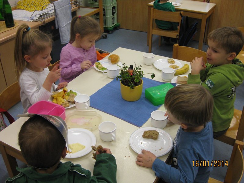 gleitendes Frühstück Die Kinder können ihr mitgebrachtes Frühstück mit ihren Freunden am Frühstückstisch im Gruppenraum essen. Dazu stellen wir Milch, Kakao, Tee und Wasser bereit. Gelegentlich und an den Geburtstagen bereiten wir mit den Kinder ein gemeinsames Frühstück zu  |